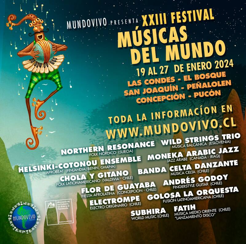 El XXIII Festival Músicas del Mundo ya tiene en agenda sus fechas para 2024. El evento se realizará entre el 18 y el 30 de enero en el Parque Santa Rosa de Apoquindo, perteneciente a los co-productores y principales auspiciadores de este festival; la Corporación Cultural de Las Condes.