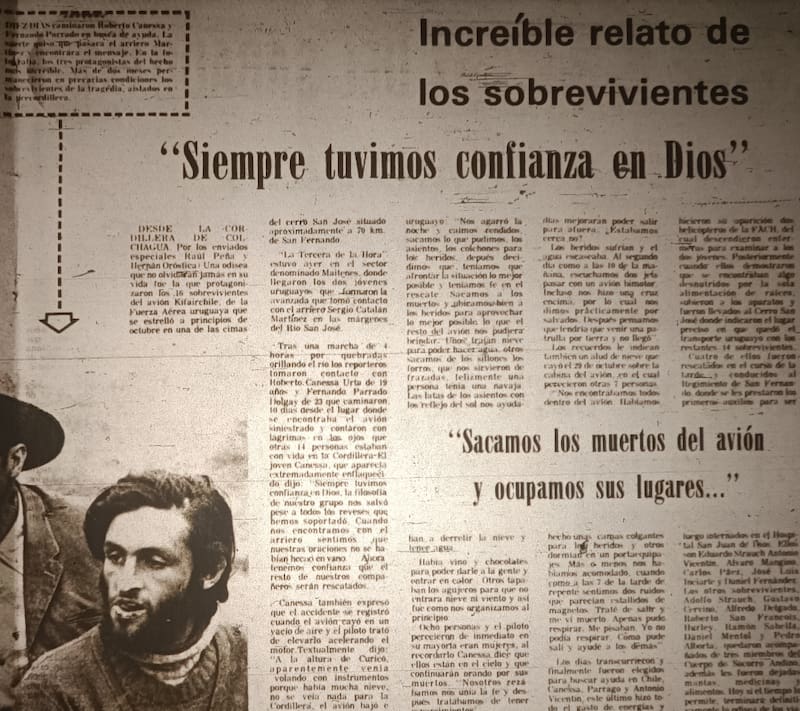 “Siempre tuvimos confianza en Dios”, dijo un famélico Canessa. Posteriormente, narró con detalle el accidente y las dificultades del clima. “Nos agarró la noche y nos caímos rendidos, sacamos lo que pudimos, los asientos, los colchones para los heridos, después decidimos que teníamos que afrontar la situación lo mejor posible y teníamos fe en el rescate. Sacamos a los muertos y ubicamos bien a los heridos”, relató el joven de 19 años, según las páginas de La Tercera.