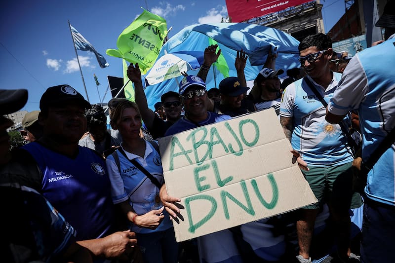 Doce horas duró la huelga general convocada por la Confederación General del Trabajo (CGT, el principal sindicato del país), a modo de mostrar el descontento por la aprobación del decreto de necesidad y urgencia (DNU), que entró en vigor el 29 de diciembre. Asimismo, este grupo de protesta se opone a la conocida como ley ómnibus –Bases y Puntos de Partida para la Libertad de los Argentinos–, un conjunto de más de 660 artículos que modificarían 20 leyes, que conllevan una reestructuración institucional.