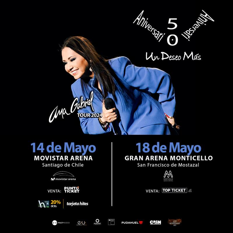 La cantante mexicana Ana Gabriel regresa a nuestro país. La artista agendó dos presentaciones: el 14 de mayo en Movistar Arena y el 18 de mayo en el Gran Arena Monticello.
