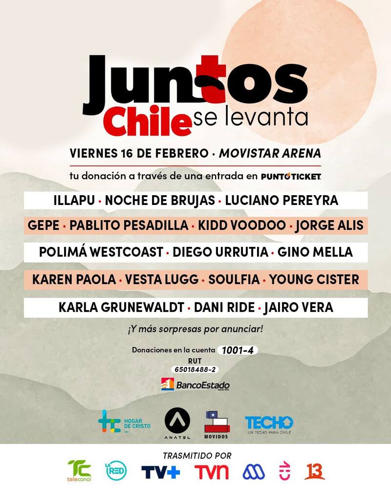 El evento solidario Juntos Chile se levanta, en ayuda de los damnificados y afectados por los incendios en Valparaíso y Viña del Mar, ya tiene a gran parte de su cartel de artistas; desde bandas como Illapu y Noche de Brujas, a invitados internacionales como Luciano Pereyra.