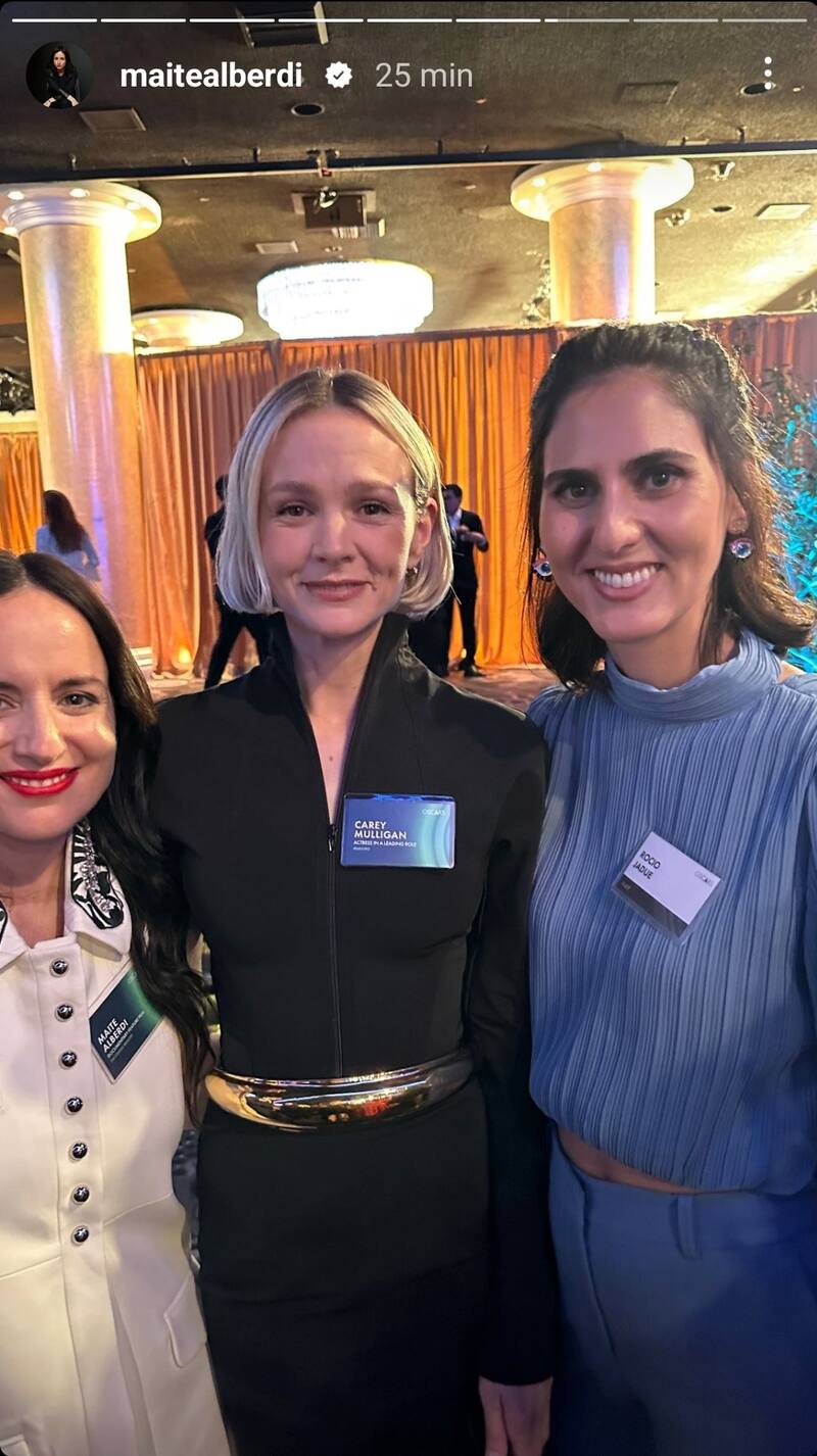 También estuvo junto a Bradley Cooper y Carey Mulligan, ambos nominados por Maestro, el filme de Cooper sobre el matrimonio conformado por el compositor Leonard Bernstein y la actriz Felicia Montealegre. Esos encuentros quedaron inmortalizados en fotografías que Alberdi subió a su cuenta de Instagram. Lo mismo ocurrió con su conversación con el español J. A. Bayona, el director de La sociedad de la nieve, la cinta que el sábado arrasó en la gala de los Goya.