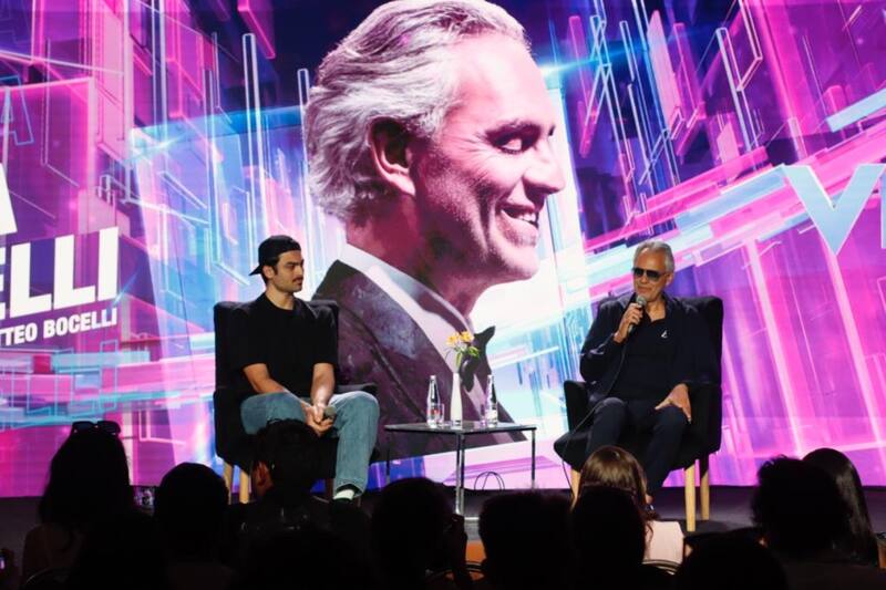 Bocelli entra a la rueda vestido de sport, de azul marino, en compañía de su hijo Mateo, quien también lo acompañará en escena. “Estoy feliz de que me haya invitado, se que su standard es muy alto, y es un modo de vivir la música muy linda -dice Mateo-. Todo lo que escucharemos es musica en vivo y más de 60 músicos en orquesta. Indiscutiblemente, una linda experiencia”.