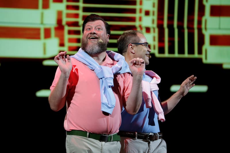 Juan Pablo Flores y Rodrigo Salinas, vestidos con poleras piqué y un chaleco amarrado a sus cuellos, se acercaron a Freire inmersos en sus personajes de la alta sociedad, “José Ignacio, José Ignacio” y “Luis Patricio, Luis Patricio”.