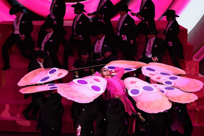 Acompañado de un cuerpo de baile vestido de negro y con corbatas rosas, el actor acompañado de su compañero de elenco, Simu Liu, dieron el tercer número musical de la ceremonia de premios. Fue uno de los grandes pasajes de la velada. Espectáculo puro.
