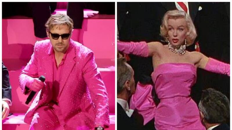 En esa parte de la cinta de Howard Hawks, la icónica actriz de Hollywood aparece con un vestido completamente rosado y rodeada de hombres, quienes están vestidos con un esmoquin y una banda roja, tal como en la presentación de Gosling.
