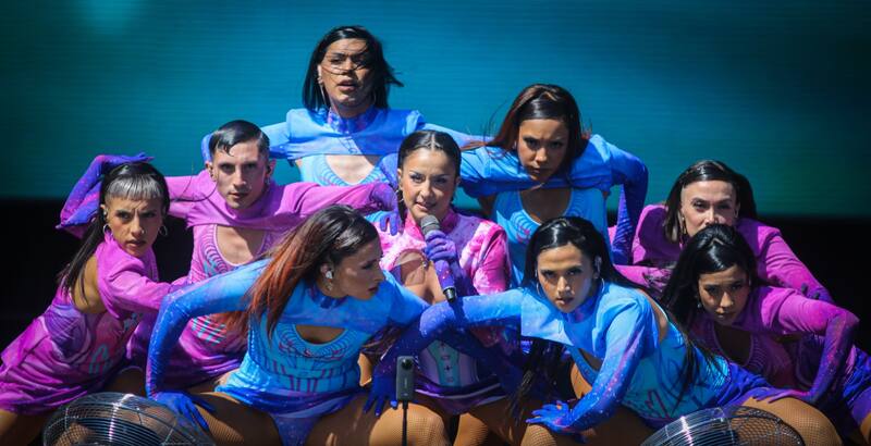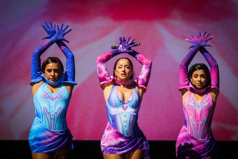 En la calurosa tarde de Cerrillos, cuando el termómetro marcaba los 29 grados, Denise Rosenthal apareció a las 15.30 para presentarse en el escenario Cenco Malls. Con un ceñido traje entre violeta y azul, ad hoc a su estampa de cantante pop y rodeada por su cuerpo de bailarinas comenzó con la canción Agua segura, la misma que la unió con Mala Rodríguez. “Soy suficiente, soy muy valiente / Poco obediente, intransigente”, canta, en un himno al empoderamiento femenino. De hecho, su banda está conformada solo por mujeres.