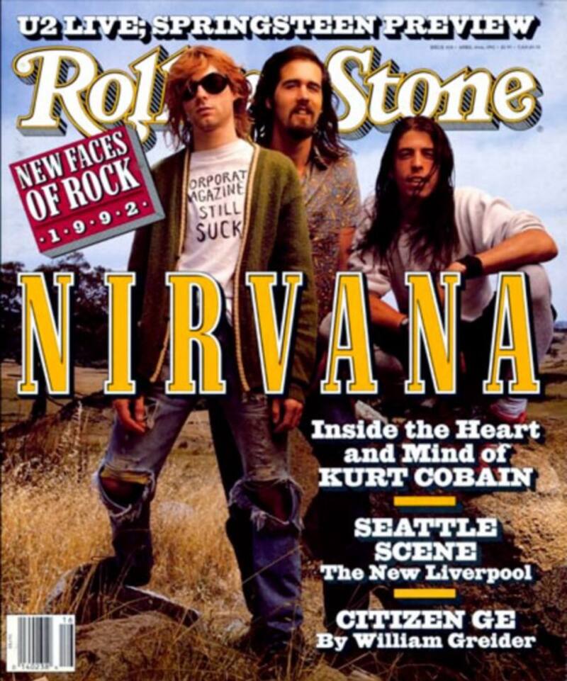 La portada de la Rolling Stone de abril de 1992 donde posa junto a Krist Novoselic y Dave Grohl con una polera que rezaba “las revistas corporativas todavía apestan”, resume una ambivalencia magistral; la expresión bien aprendida del manual rockstar clásico, un contestatario que apunta y dictamina, para luego marcharse en limusina a una residencia con habitaciones de sobra.