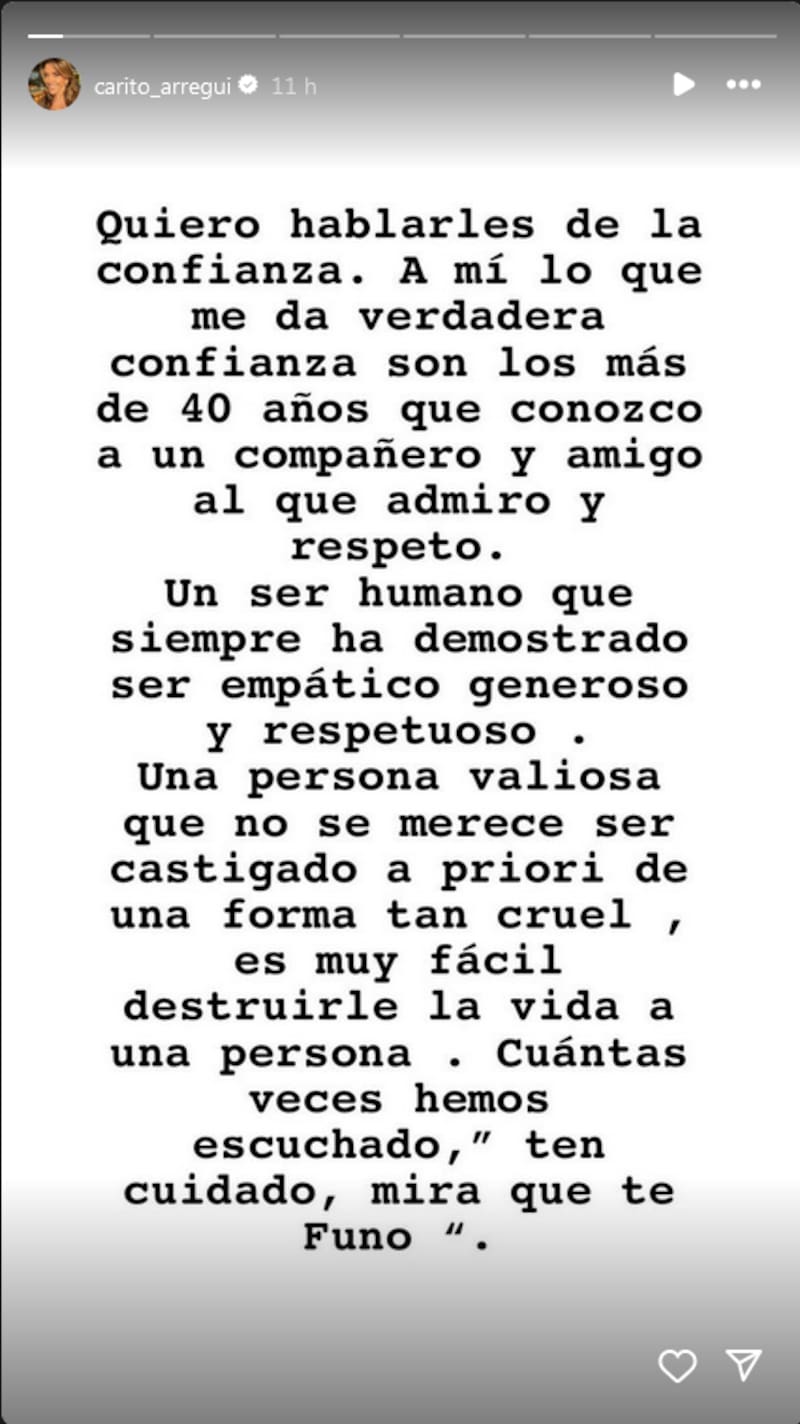 “Quiero hablarles de la confianza. A mí lo que me da verdadera confianza son los más de 40 años que conozco a un compañero y amigo al que admiro y respeto”, escribió en una historia en esa red social. “Un ser humano que siempre ha demostrado ser empático, generoso y respetuoso. Una persona valiosa que no se merece ser castigado a priori de una forma tan cruel”.