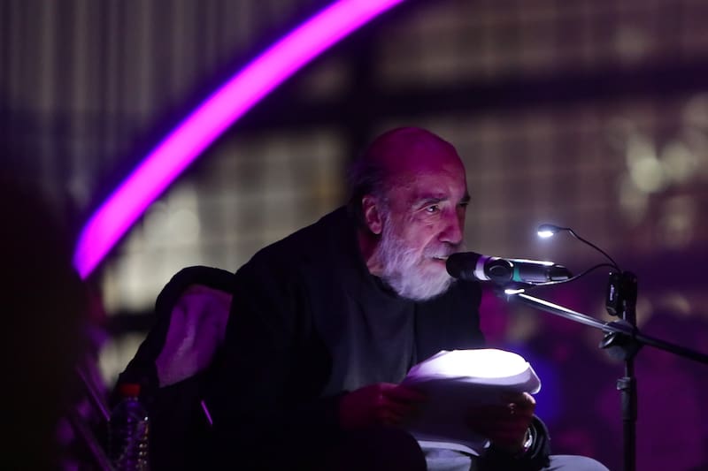 Zurita craneó y probó ideas para llevarlo a cabo, sin lograrlo, hasta que se topó con el colectivo Delight Lab. Sí, los mismos que han proyectado frases en edificios y otros lugares emblemáticos a base de rayos de luz, como el “Chile despertó” en el edificio de Telefónica durante el estallido social. Pero el colectivo también tiene experiencia en proyectar poemas, como el verso de José Ángel Cuevas en Plaza Baquedano en 2020. Entre Zurita y Delight Lab ya hubo una acción conjunta previa, cuando en el cierre de la pasada Furia del Libro de Invierno 2023 se realizó una “lectura furiosa” donde Zurita leyó algunos de sus versos con una proyección lumínica en toda la Estación Mapocho de fondo. Impresionante.