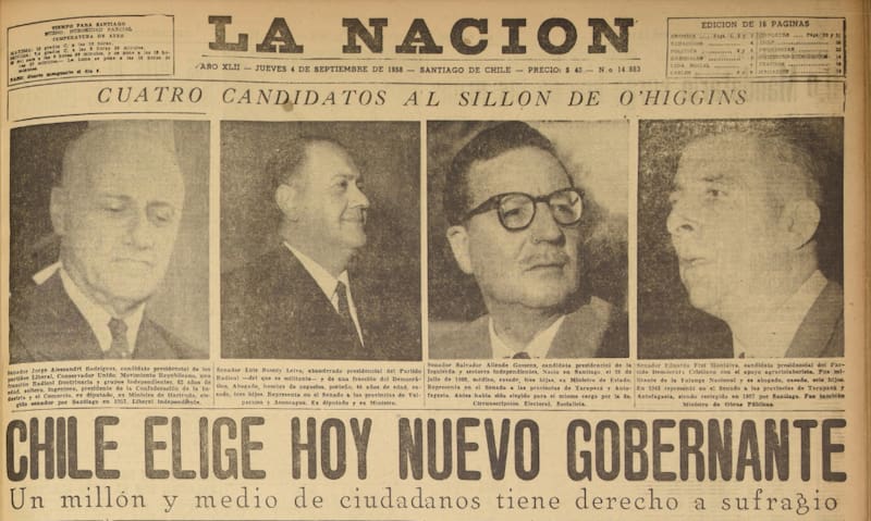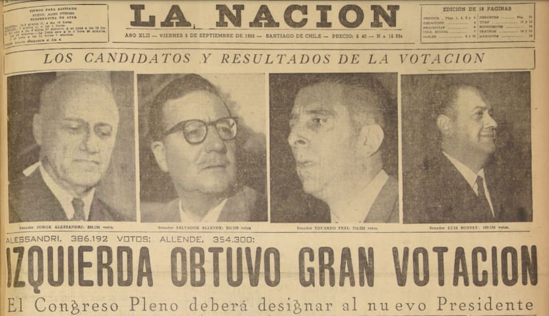 Pero la jornada electoral tuvo una sorpresa. En la mañana del 5 de septiembre de 1958, los kioskos vieron el titular de La Nación destacando la votación de Allende. Pero la realidad era más compleja. El médico socialista alcanzó un 28,8%, efectivamente un buen porcentaje, pero no le alcanzaba para obtener la primera mayoría relativa, en manos de Jorge Alessandri, con un 31,5%. Debido a que ninguno alcanzó la mayoría absoluta, según la Constitución de 1925, le correspondió al Congreso dirimir al ganador entre las dos primeras mayorías relativas.