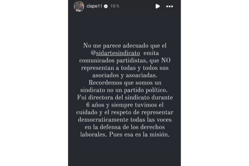 “No me parece adecuado que el @sindartessindicato emita comunicados partidistas, que NO representan a todas y todos sus asociados y asociadas. Recordemos que somos un sindicato, no un partido político”, escribió. “Fui directora del sindicato durante 6 años y siempre tuvimos el cuidado y el respeto de representar democráticamente todas las voces en la defensa de los derechos laborales. Pues esa es la misión”, agregó.