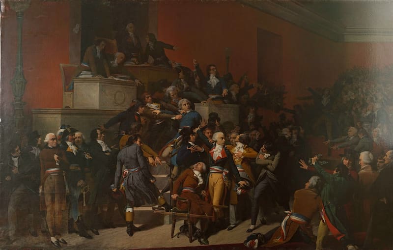 Un grupo que integraron Fouché, Collot d’Herbois, Frèron y Barras tramaron el arresto y deposición de Robespierre. Como Julio César en las idus de marzo ante el Senado, la escena se desarrolló en la sala de sesiones de la Convención, en el Palacio de la Tullerías. “El 27 de julio de 1794, 9 de termidor del Año II, cuando Saint-Just (NdR: un partidario de Robespierre) tomó la palabra ante la Convención, le interrumpió el diputado Tallien, quien azuzado por el encarcelamiento de su prometida, la española Teresa Cabarrús, acusó a Robespierre de aspirar a la tiranía. Robespierre se sintió aludido y quiso responder, pero una avalancha de voces ahogó la suya, apoyando a Tallien y pidiendo la detención del Incorruptible y sus adeptos como traidores a la República y la revolución. ‘¡La sangre de Danton te ahoga!’, le gritó Garnier, recordando el infausto hecho”, relata Bolinaga.
