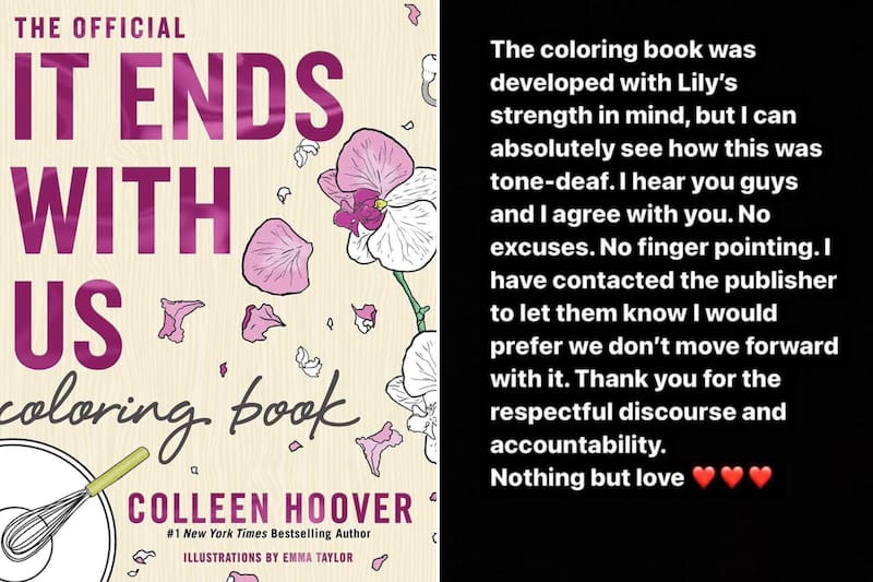 A las pocas horas de haber anunciado este producto, tanto la editorial como Hoover, confirmaron que el proyecto no se llevaría a cabo, cancelando la publicación. A través de una historia de Instagram, Hoover compartió: “El libro para colorear fue desarrollado con la fortaleza mental de Lily, pero puedo entender absolutamente que ha sido insensato. Os escucho y estoy de acuerdo con vosotros. No hay excusas. Sin señalar con el dedo. Ya me he puesto en contacto con el editor para hacerle saber que prefiero no seguir adelante con esto. Gracias por el discurso respetuoso y la responsabilidad. Nada más que amor”.