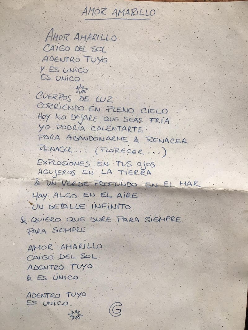 Como lo hizo en otros momentos, Gustavo solía mostrar bosquejos de canciones a sus parejas para obtener algún feedback. En Amor Amarillo no fue la excepción. “Yo estaba aún en la universidad así que durante el día no estaba mucho -rememora Cecilia-. A la tarde volvía, me mostraba un poco lo que había armado y yo metía la cuchara un poco. Como ya estaba embarazada me venía el cansancio temprano y a la noche Gus usaba auriculares para no despertarme. Venían amigos, era divertido”.