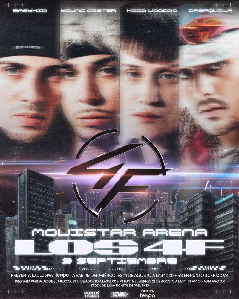 Los tickets para Los 4F se pueden adquirir en preventa exclusiva Tenpo a partir del miércoles 21 de agosto a las 12 horas (mediodía) o hasta agotar stock de 8.000 tickets, mientras que la venta general será a partir del viernes 23 de agosto a las 12.30 horas o al agotar stock de 8.000 boletos en preventa.