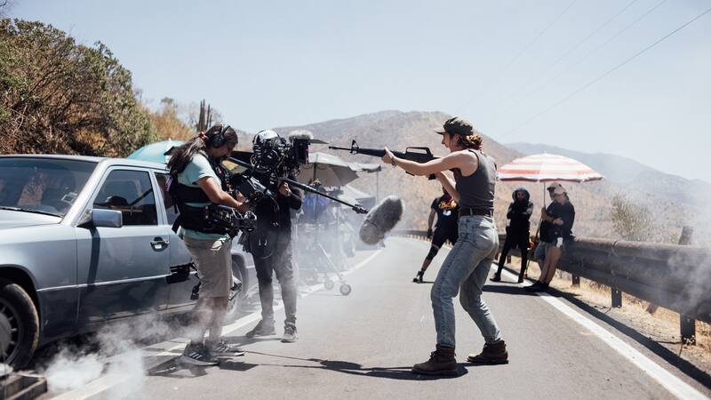 Ernesto Díaz, el director de acción del proyecto, supervisa que todo esté en orden para filmar una escena en que el grupo liderado por Tamara y Rodrigo percute disparos contra la escolta. Todos los actores portan armas de utilería que semejan ser M16 –no cargadas– y están preparados para repetirla las veces que sea necesario.