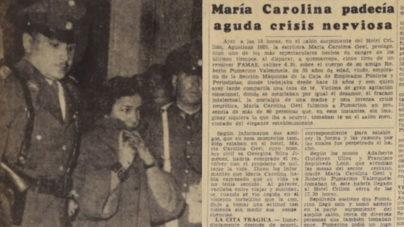Una tarde de abril de 1955, en el Hotel Crillón, la escritora María Carolina Geel protagonizó el crimen que terminó con la vida de su amante Roberto Pumarino. Los diarios de la época reaccionaron de inmediato ante este escándalo de la aristocracia chilena, buscando las razones tras los cinco disparos y vinculando el hecho con los libros de la autora.