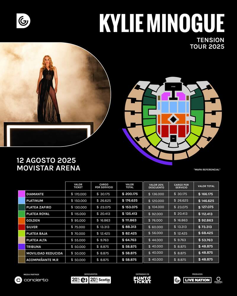 El show de Kylie Minouge en Chile está agendado para el próximo 12 de agosto en el Movistar Arena. Marca un regreso tras su recordado show de 2008 en la pista atlética del Estadio Nacional.