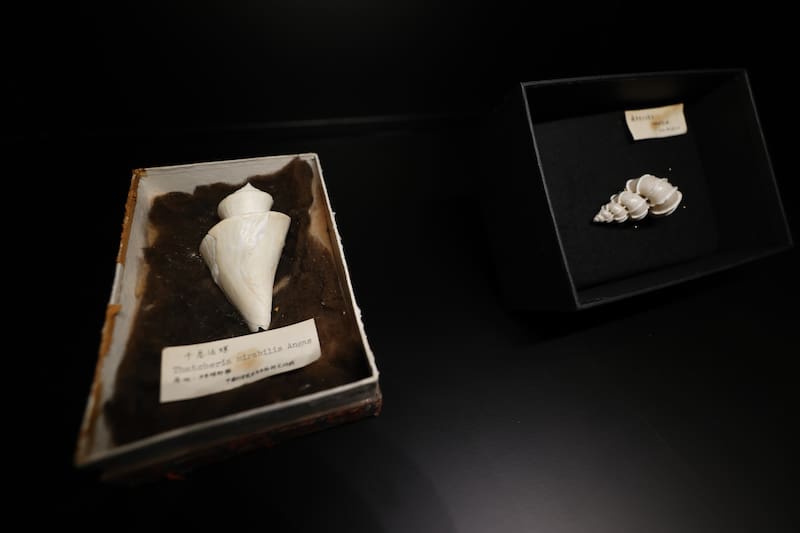 La Thatcheria mirabilis es una de las primeras caracolas que puede apreciarse en la exposición. “Este tipo se encuentra muy poco y es de aguas profundas”, precisa Nathaly Calderón. Es más, los rumores dicen que fue el mismo presidente chino Mao Zedong quien le entregó la Thatcheria mirabilis a Pablo Neruda.