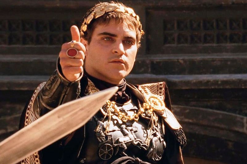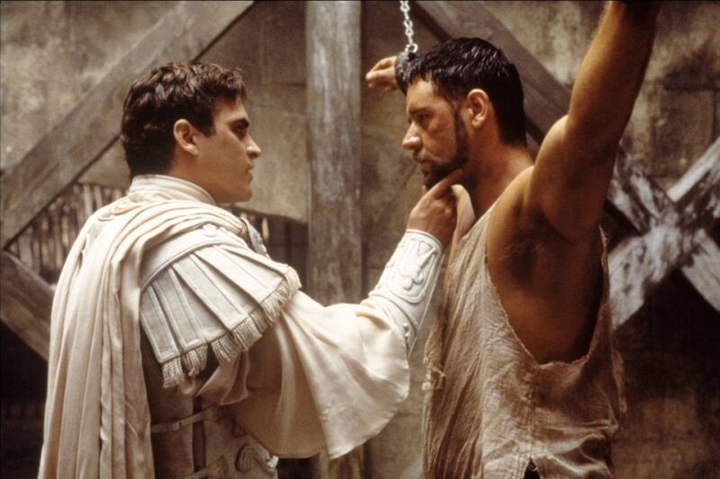 Hacia la parte final de Gladiador (2000), Cómodo (Joaquin Phoenix) organiza un espectáculo en el Coliseo en el que lucha mano a mano con Máximo (Russell Crowe), con el fin de acabar públicamente con su rival. Sin embargo, a pesar de que lucha con ventaja porque Máximo está herido, todo le sale mal y es finalmente el exgeneral romano quien se hace con el triunfo.