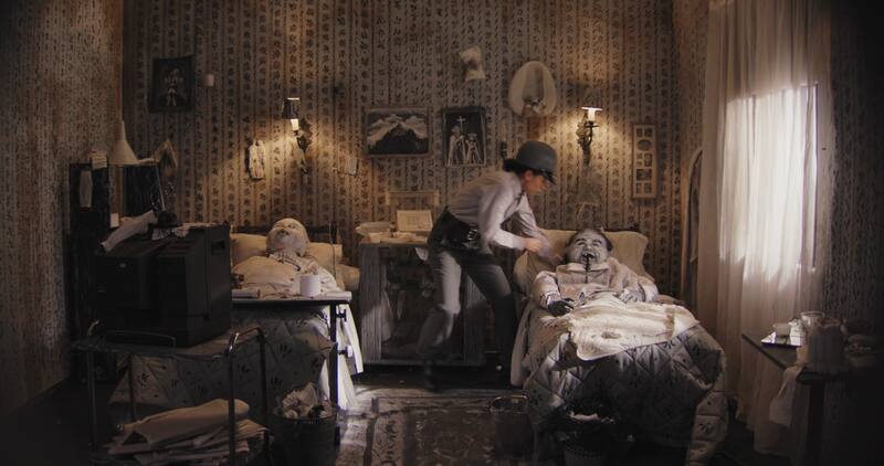 En los primeros minutos se revela que la productora de León y Cociña habría sufrido un robo en el que fueron sustraídos los materiales no digitalizados de una película filmada en celuloide (algo que, por cierto, ya habían planteado en la charla Recuerdos de Los hiperbóreos, realizada en 2021). La protagonista de esa cinta perdida, la actriz Antonia Giesen, es quien se para frente a la cámara y da la bienvenida al espectador al set de Los hiperbóreos.