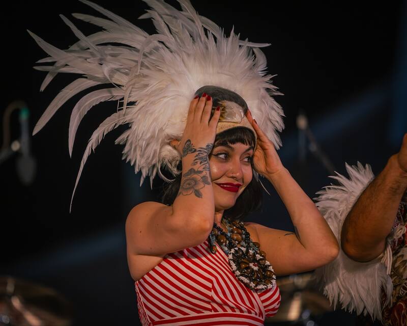 Pasadas las 20.30, y luciendo un llamativo tocado de plumas de gallo en el cabello, Nehe Nehe salió a cantar junto a su guitarrista, Piri. Sus temas, cantados en lengua rapanui, se sostienen en una cadencia cercana al reggae y la voz cálida de la artista. Luego se sumaron otros músicos y entró en escena una de las candidatas a reina de la Tapati 2025, quien bailó un aparima, estilo propio de la Polinesia.
