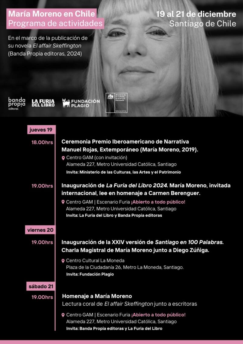 El programa de actividades de María Moreno comienza la tarde del jueves 19 de diciembre con la ceremonia de entrega del Premio Iberoamericano de Narrativa Manuel Rojas (extemporáneo, 2019), otorgado por el Ministerio de las Culturas, las Artes y el Patrimonio. Luego, a las 19.00 hrs., la escritora participará de la inauguración de la XIII versión de la Furia del Libro, con una lectura en homenaje a Carmen Berenguer, actividad abierta a todo público que se desarrollará en el Centro Cultural GAM (Av. Libertador Bernardo O’Higgins 227, Metro Universidad Católica).