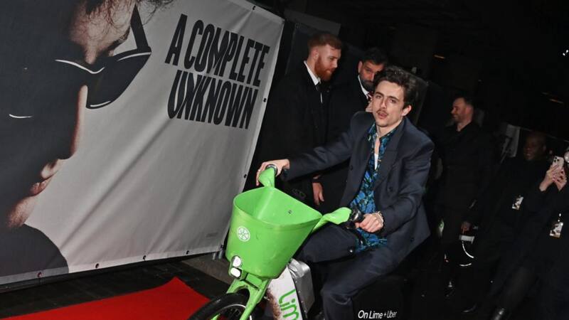 La gira de prensa mundial de Timothée Chalamet para promocionar Un completo desconocido se volvió viral cuando acudió en bicicleta eléctrica al estreno en Londres de la aclamada película biográfica de Bob Dylan.