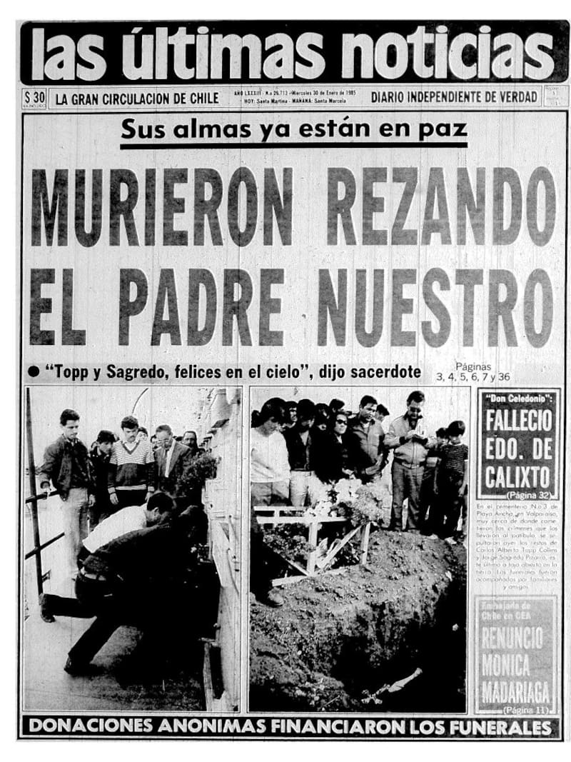 A las 6 de la mañana, del 29 de enero de 1985, declararon muertos a los llamados ‘psicópatas de Viña’. “Los cuerpos de ambos se agitaron un par de segundos y desde el corazón de Sagredo brotó un hilo de sangre que regó el piso a sus pies, como si hubieran abierto una llave”, relató Cisternas.