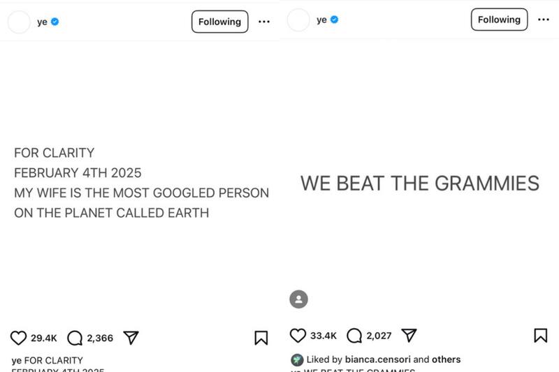 El martes, West publicó en Instagram: “PARA QUE QUEDE CLARO. MI ESPOSA ES LA PERSONA MÁS BUSCADA EN GOOGLE EN EL PLANETA LLAMADO TIERRA” y agregó “GANAMOS A LOS GRAMMY”. La publicación estaba acompañada de capturas de pantalla de Google Analytics que mostraban el interés en Censori. E! News informó sobre las publicaciones, que actualmente se encuentran eliminados.