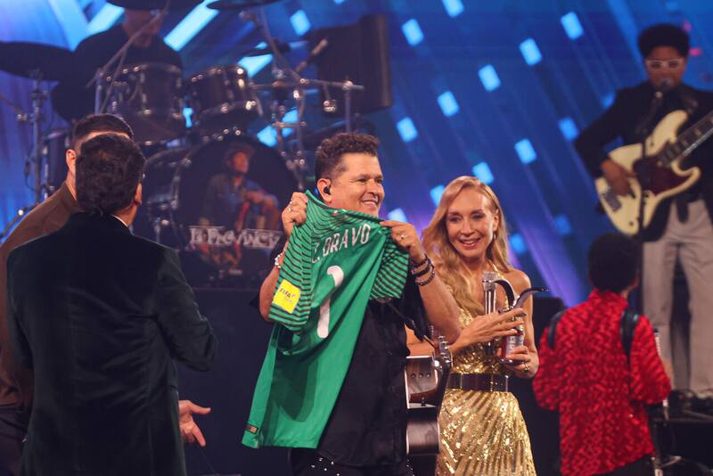 “A mí me encomendaron una misión esta noche. Vengo en representación de todo nuestro país. Nos comentaron que te encanta el fútbol, así que espero que te lleves a casa este lindo recuerdo de todo Chile”, señaló el deportista, entregándole al músico su icónica camisa de la Selección, con su apellido “Bravo” grabado en la espalda acompañado del número “1″.