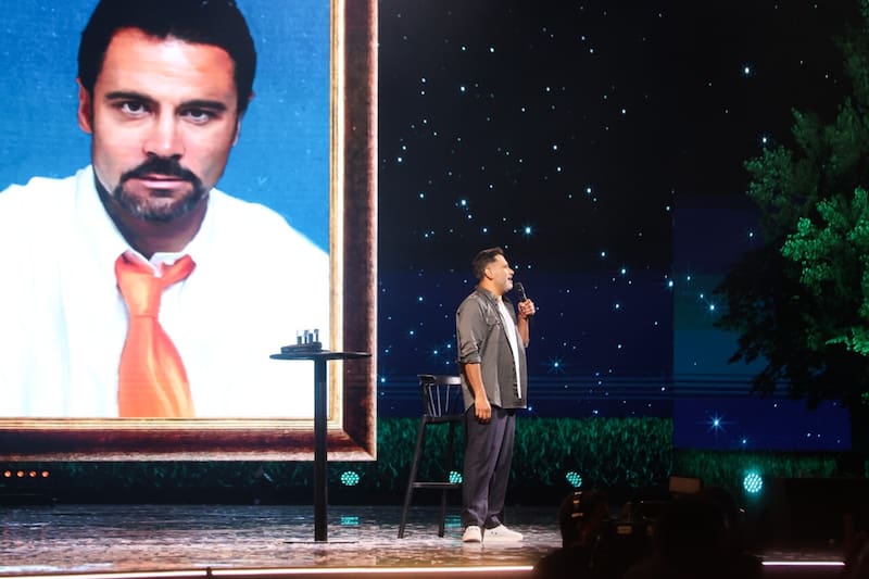 En un momento de su relato, recordó los antiguos matinales de televisión. “En los 90 los matinales eran distintos”, dijo para luego introducir uno de los momentos destacados de su show. “Quiero que se escuche una ovación, un homenaje para el gran rostro de los matinales. para aplaudir a Felipe Humberto Camiroaga”, pidió y desató los aplausos entre el público.