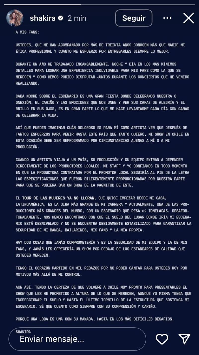 “Pueden imaginar lo doloroso que es para mí como artista ver que después de tantos esfuerzos para venir a este país que tanto quiero, mi show en Chile en esta ocasión debe ser reprogramado por circunstancias ajenas a mí”, agregó la cantante.