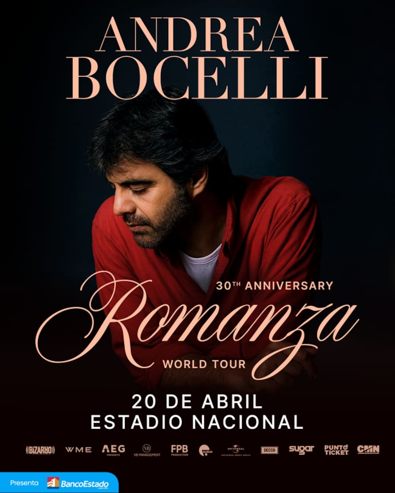 Durante la jornada del 18 de febrero, Bizarro Live Entertainment anunció que el legendario cantante italiano Andrea Bocelli realizará un concierto en Chile el 20 de abril de 2026. Este será parte de su gira mundial para celebrar el aniversario de 30 años de Romanza, el álbum que lo catapultó a la fama mundial.