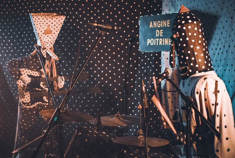 Se definen como una “orquesta de rock microtonal de música dada pitágora-Cubista”. Un concepto tan inasible como el aspecto con el que suelen presentarse en directo. Lo que es claro, es que el dúo francocanadiense Angine de Poitrine (se pronuncia An-shin de puat-rin), no deja indiferente a nadie.