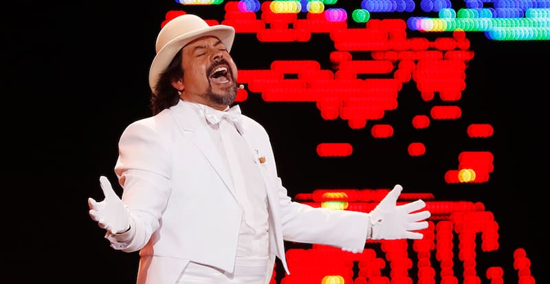 Vestido con su característico traje y sombreros blancos, Fica irrumpió en el escenario y expresó su entusiasmo de ser parte de un “nuevo programa que espero sea una tradición”. Partió bromeando con que repetiría los chistes que dijo en el Festival de Las Condes 2025, certamen también transmitido por el canal domiciliado en Av. Pedro Montt.