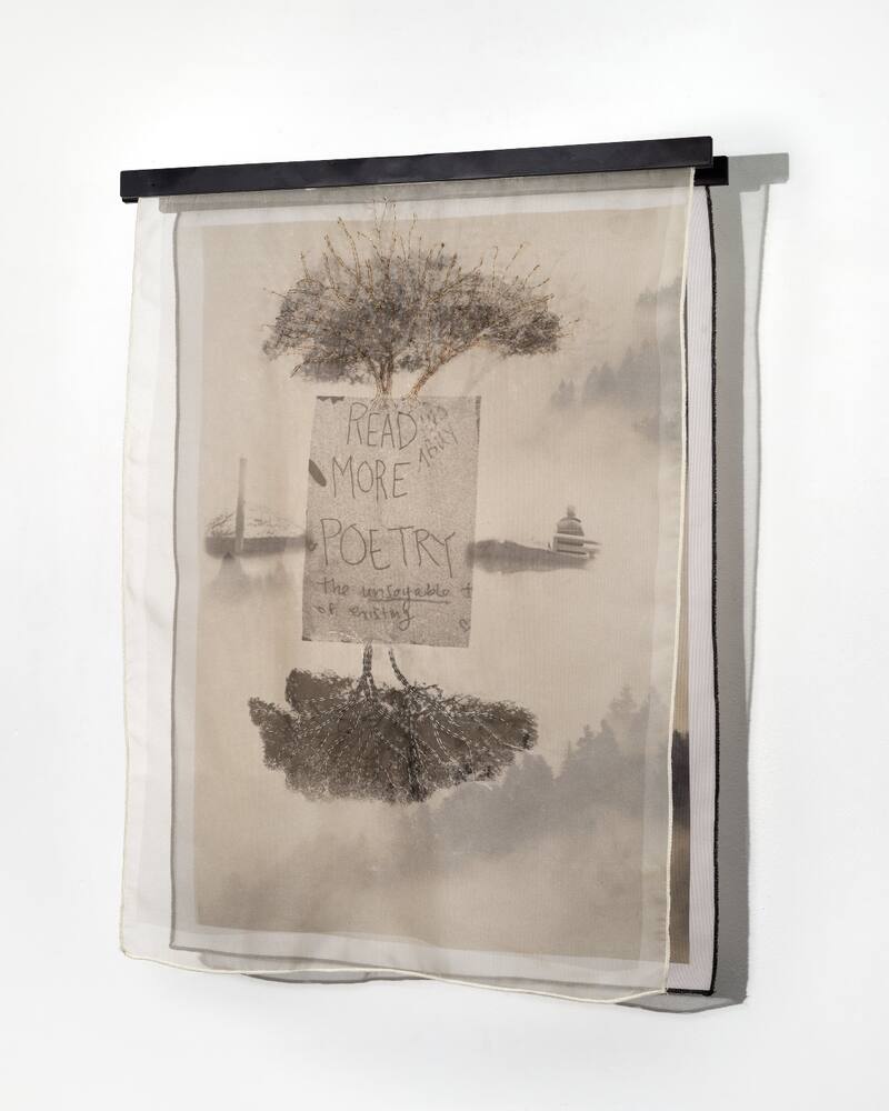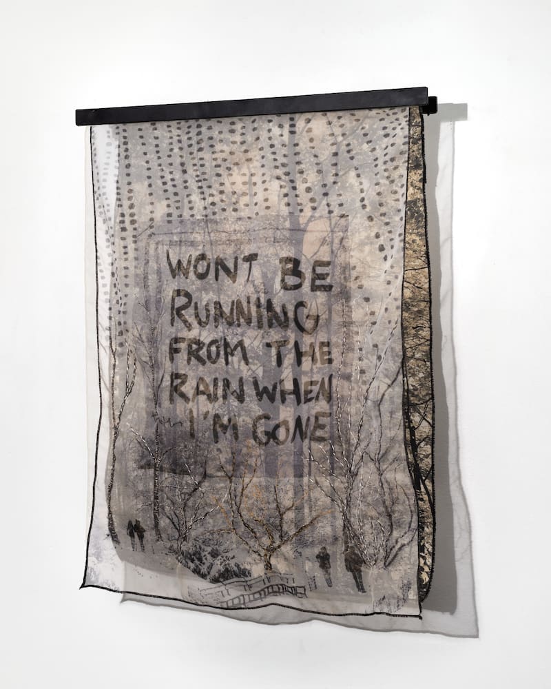 En la muestra, estos textos se conjugan con imágenes recolectadas a lo largo del tiempo. Inspirada en la tradición del collage, Guelfenbein ensambla elementos diversos para construir nuevos significados. Las obras, compuestas por capas de algodón y seda impresas y bordadas, transforman frases urbanas en susurros y reflexiones sobre la memoria y la identidad.
