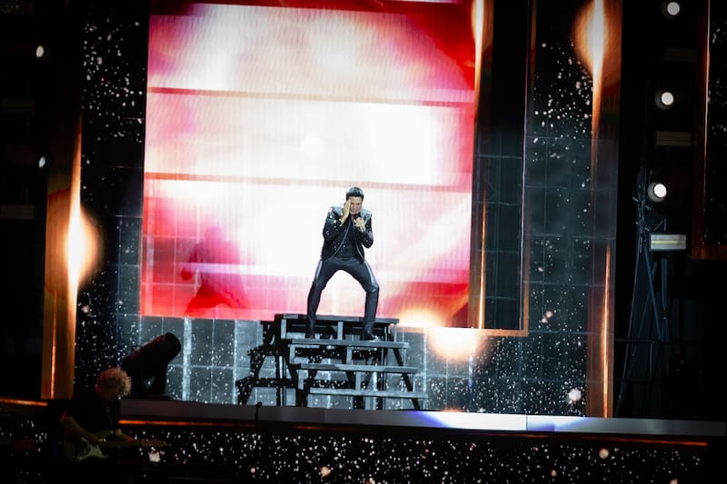 De la fiesta, pasó al momento más íntimo de la noche. Tras cantar Si nos quedara poco, reflexionó sobre el paso del tiempo y la importancia de la familia con un piano de fondo que sumaba dramatismo. “Aunque los míos no están, de otra manera están en mi corazón (...) Somos latinos y somos de familia”, enfatizó. Con ello dio paso a la canción que cierra su disco de 2023, Te amo y punto.
