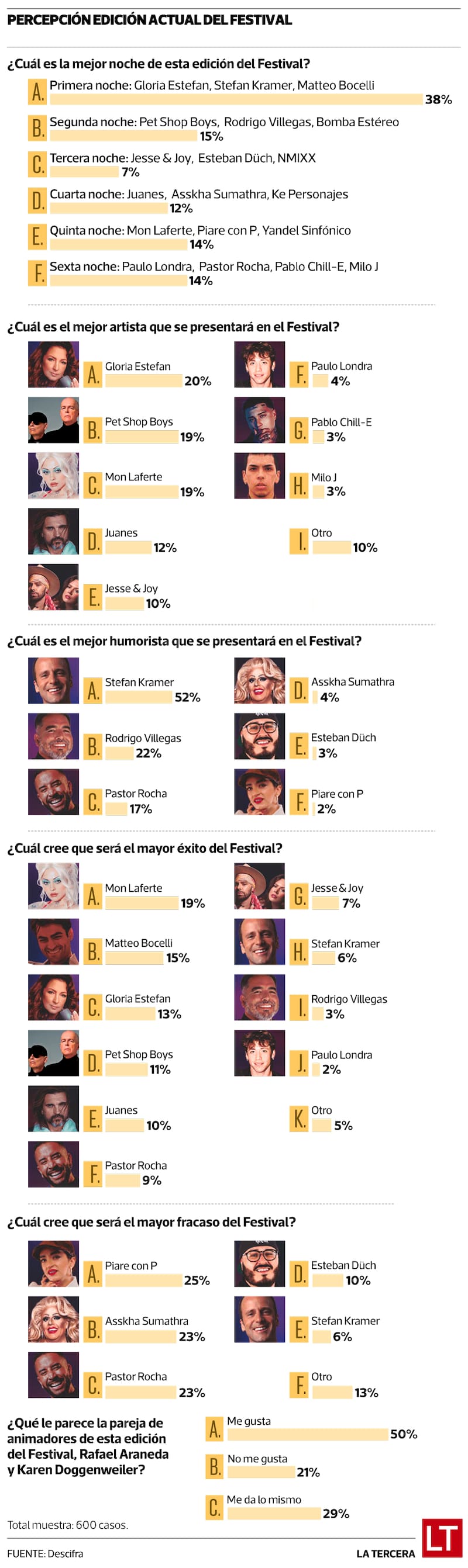 Consultados por la mejor noche de esta edición, el 38% se inclina por la jornada inaugural, la del domingo 22, encabezada por Gloria Estefan, el humor de Stefan Kramer y la presentación de Matteo Bocelli. Es una ventaja amplia respecto de las demás fechas. En el caso de la cantante cubana, se trata de su tercera vez en el país, luego de su primera visita junto a su grupo Miami Sound Machine en 1983, aunque también se presentó en 2009 con un show propio en Movistar Arena. Es su debut en el escenario de la Quinta Vergara. Luego, Stefan Kramer firmará su cuarta vez en la Quinta tras sus shows de 2008, 2018 y 2020, en esta última hizo una rutina marcada por la contingencia del estallido social. Finalmente, Bocelli regresa a la Quinta tras deslumbrar al Monstruo cuando acompañó a su padre, el célebre Andrea, en su presentación del 2024. Esta vez, Bocelli hijo llegará en solitario.