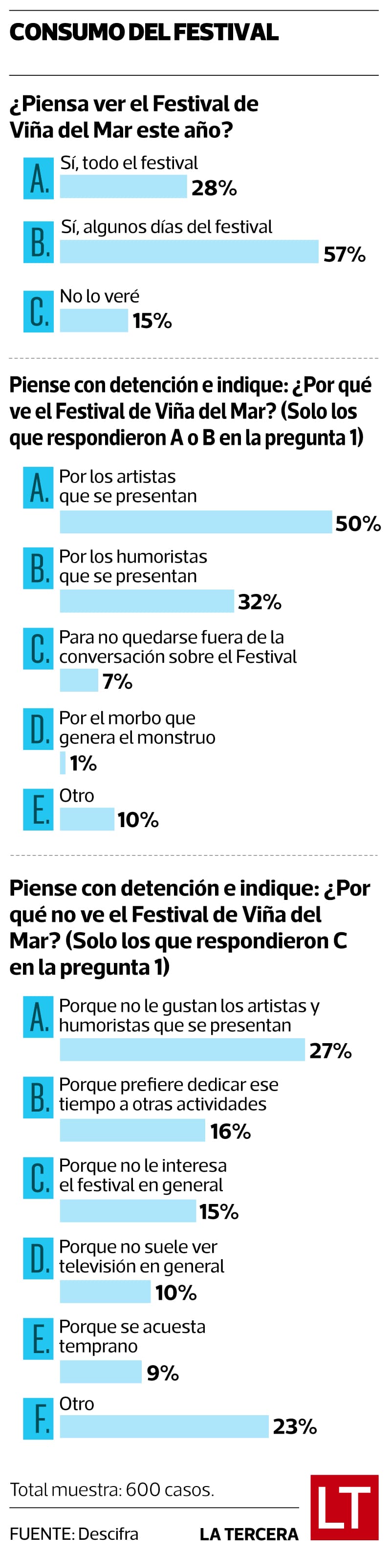 Según el sondeo de Descifra - La Tercera, el certamen que comienza este domingo 22 mantiene su hegemonía: un 85% dice que verá esta edición. Eso sí, hay fuertes críticas al precio de las entradas y más de la mitad de los consultados cree que la Gala no es un aporte. Por su lado, Stefan Kramer arrasa como el mejor comediante invitado a la cita.