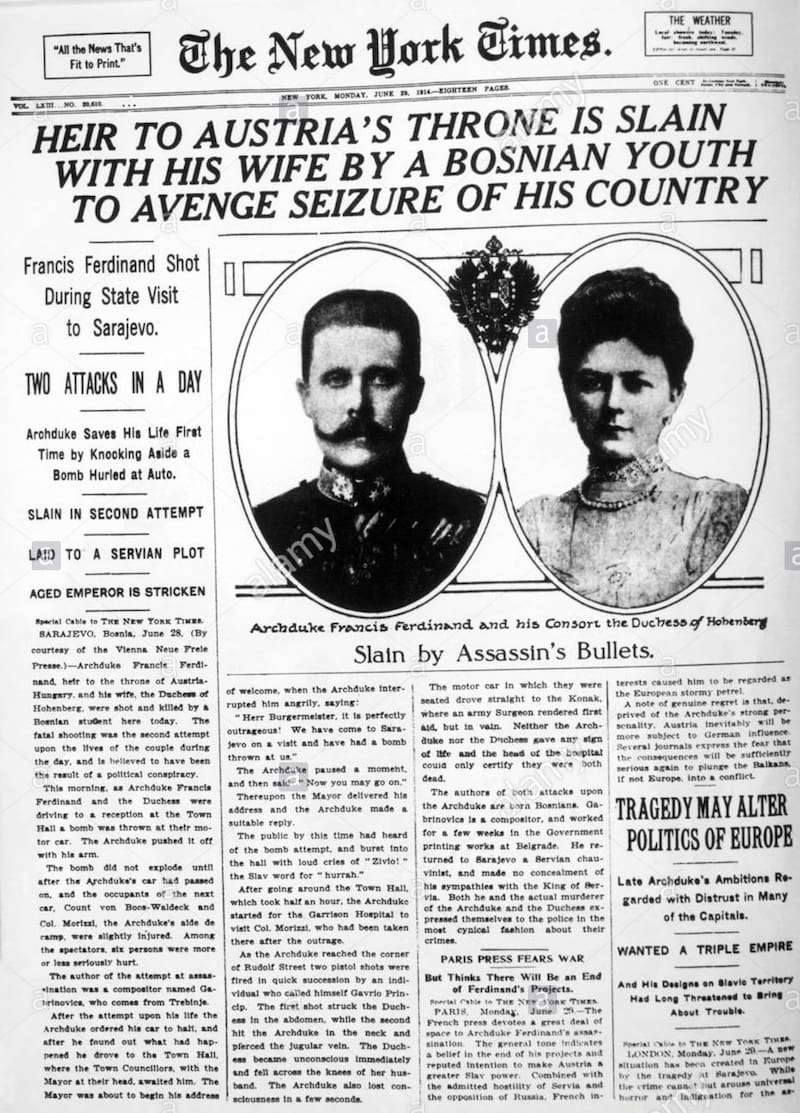 El New York Times informó de los hechos el 29 de junio de 1914, con una nota cortesía del Viena Neue Freie Presse. “El heredero al trono de Austria es asesinado junto con su esposa por un joven bosnio para vengar la confiscación de su país”, tituló el matutino. En la bajada agregó un dato relevante: “Se advirtió al heredero que no fuera a Bosnia, donde la población lo recibió con banderas serbias”.