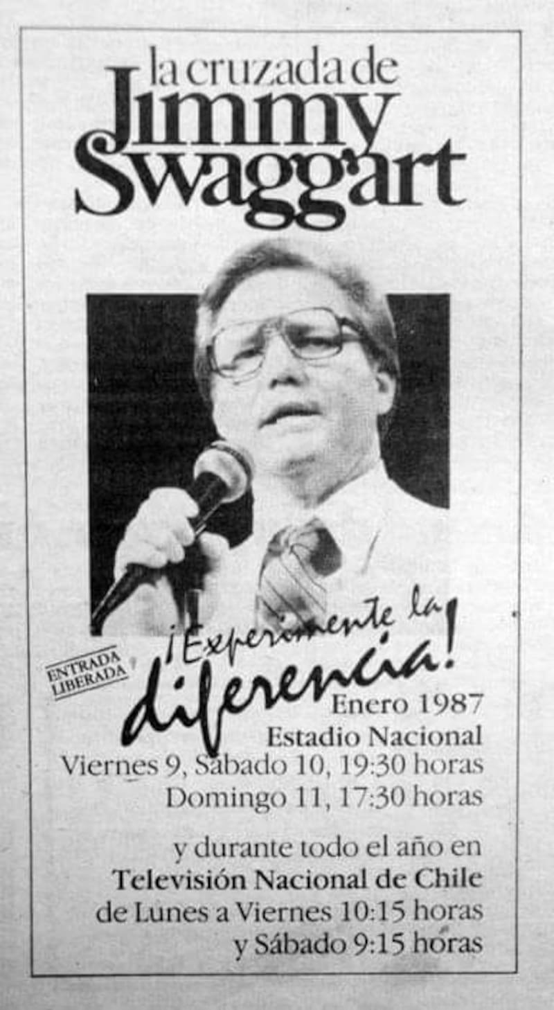 El norteamericano fue recibido además por Augusto Pinochet. Así lo recuerda Contardo: “En enero de 1987, Jimmy Swaggart visitó Chile en su gira por Latinoamérica. Venía desde El Salvador, en donde una multitud lo había recibido en un estadio. Swaggart gozaba del beneplácito de varios gobiernos centroamericanos que encontraron en su obra una fórmula de pacificación efectiva de la población en tiempos de crisis. Frente a una multitud de salvadoreños reunidos en un estadio dijo: “No les puedo prometer que vendrán mejores tiempos, pero eso no importa, porque de todos modos ustedes irán a un lugar mejor”. Claramente, no se refería a una emigración masiva, sino más bien a la conformidad que brinda creer en una vida después de la muerte. ¿Para qué criticar al gobierno por la corrupción imperante si de todos modos vamos a morir? Más importante que eso era emprenderlas contra las bandas de heavy metal -a quienes el pastor acusaba de ser seguidores de satanás- y el movimiento LGBT -el mismísimo demonio”.