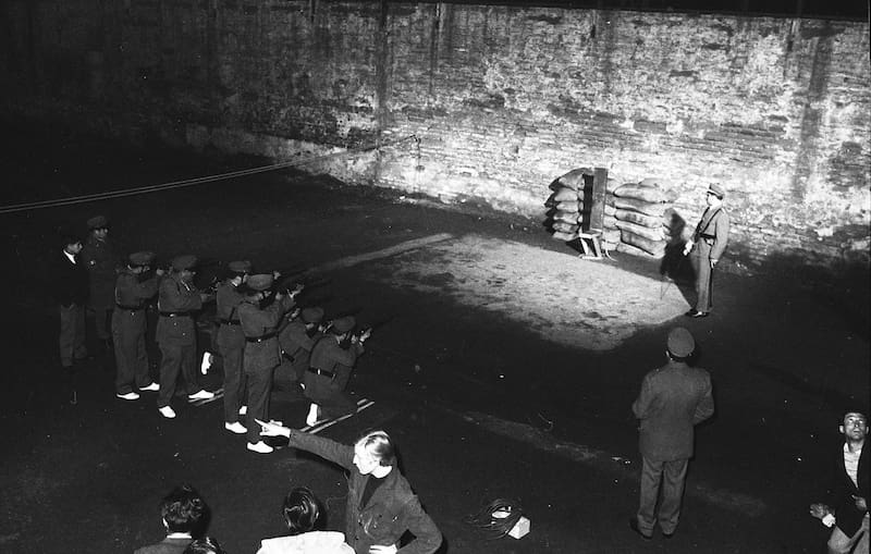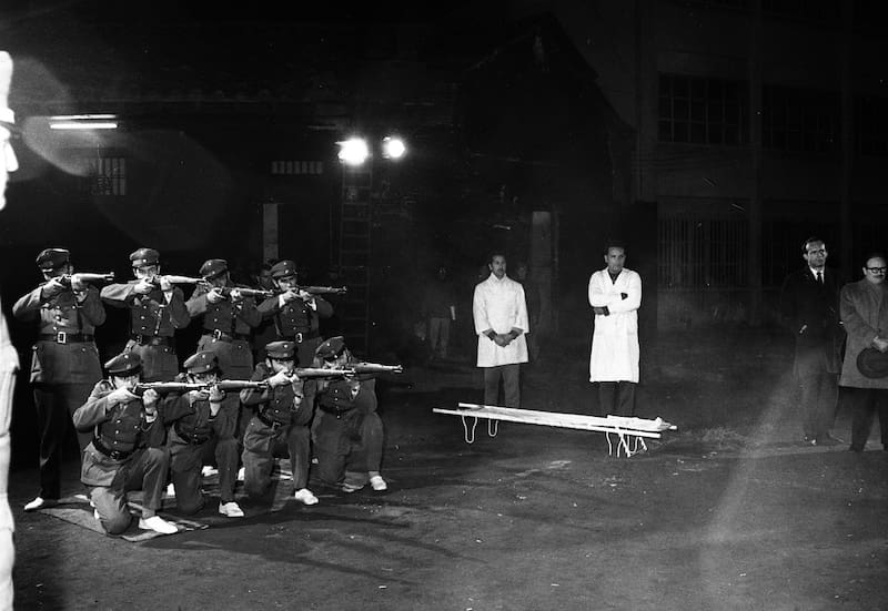 “Hay atisbos de lluvia. El padre Eloy lo acompaña firme a su lado y reza en voz alta. Lo sientan en el banquillo al frente de uno de los muros de la cárcel. Le ponen una venda por sobre el paño blanco que le cubre los ojos. El médico se acerca y le pone una marca en su corazón. Ninguno de los reos puede dormir. Escuchan atentos acostados en sus camas. Los fusileros corren en silencio con sus zapatos de goma hacia sus respectivas posiciones”.