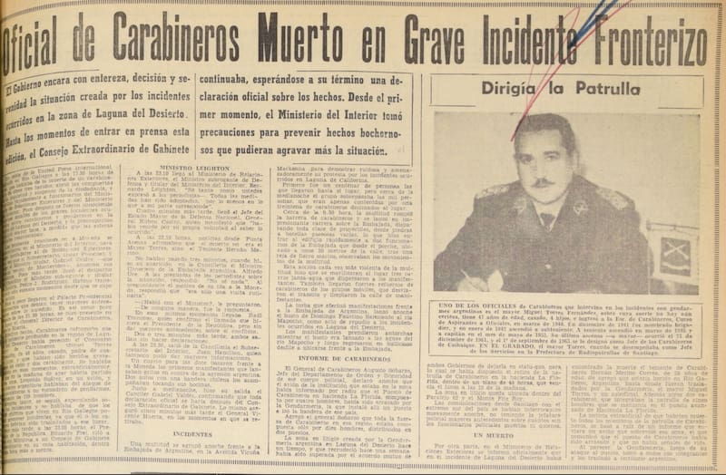 Un enfrentamiento en la zona de Laguna del Desierto, en la noche del 6 de noviembre de 1965, fue lo que terminó con la vida del teniente de Carabineros Hernán Merino, quien acudió a resguardar la frontera con otros efectivos. La noticia solo se conoció dos días después en Chile.
