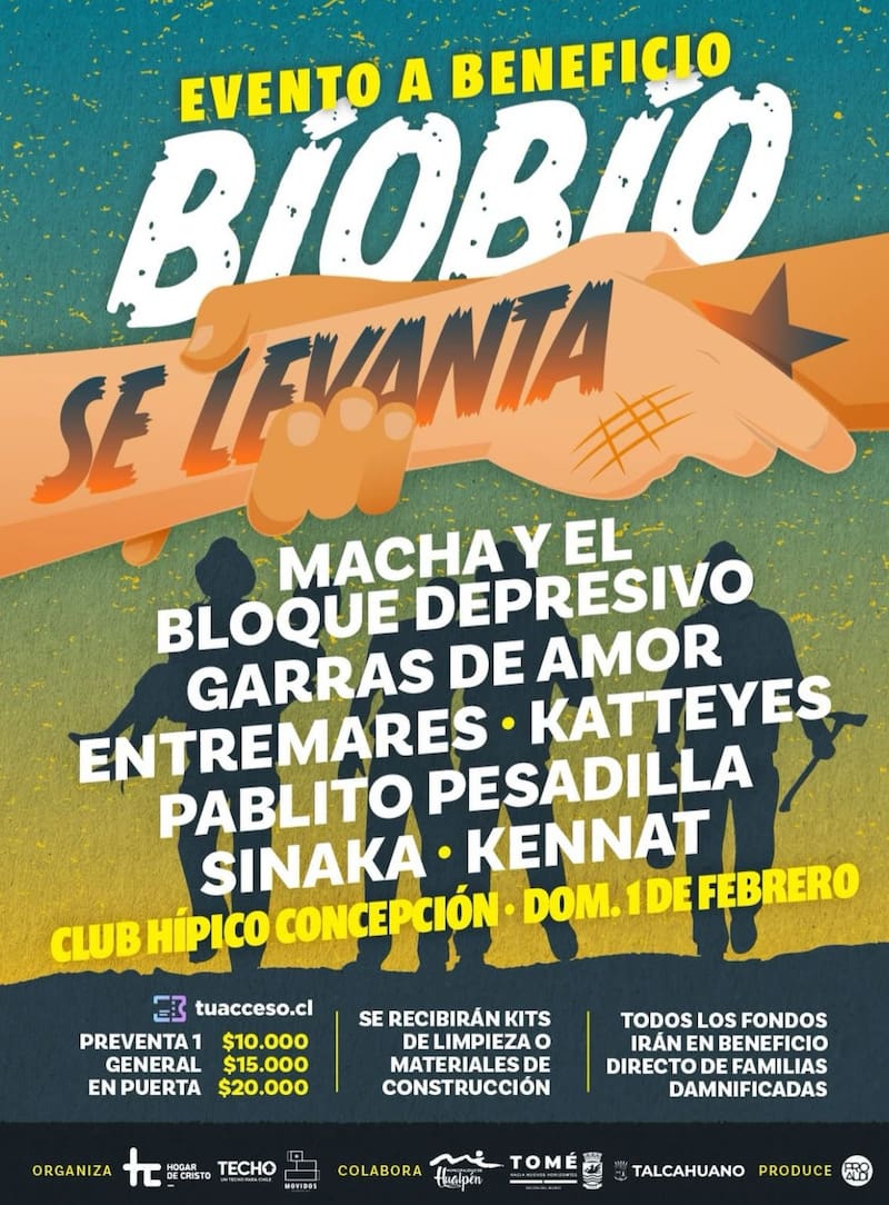 El "Biobío se levanta" es un evento a beneficio de las familias damnificadas donde estarán artistas como Macha y El Bloque Depresivo, Katteyes, Entremares y Pablito Pesadilla. Se realizará el domingo 1 de febrero en el Club Hípico de Concepción.