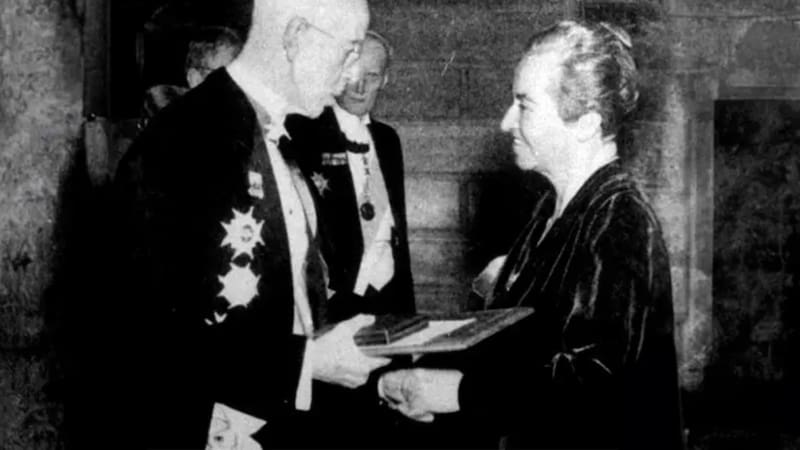 “Hoy Suecia se vuelve hacia la lejana América ibera para honrarla en uno de los muchos trabajos de su cultura”, dijo Gabriela Mistral en su discurso de recepción del Premio Nobel de Literatura, el 10 de diciembre de 1945. Ataviada con un vestido de terciopelo negro, recibió de manos del Rey Gustavo V de Suecia una caja y un diploma, objetos que la coronaban como la primera mujer hispanoamericana en merecer el premio.