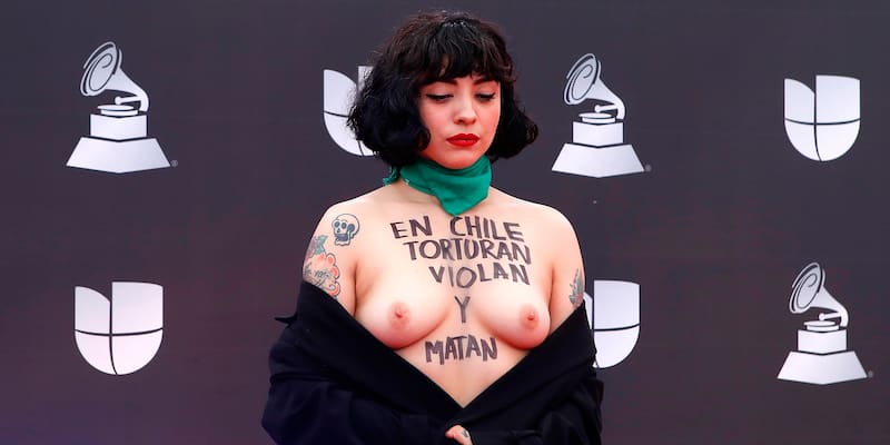 En noviembre de ese año los ojos del mundo se centraron en la artista. En la alfombra roja de los Grammy Latino, Mon Laferte, quien estaba nominada en la categoría Mejor Álbum de Música Alternativa, sorprendió con su atuendo. Con el pecho descubierto y un abrigo que cubría el resto de su cuerpo, la viñamarina llevaba escrita la consigna ‘En Chile torturan, violan y matan’. Además, un pañuelo verde, símbolo a favor del aborto gratuito, libre y seguro.
