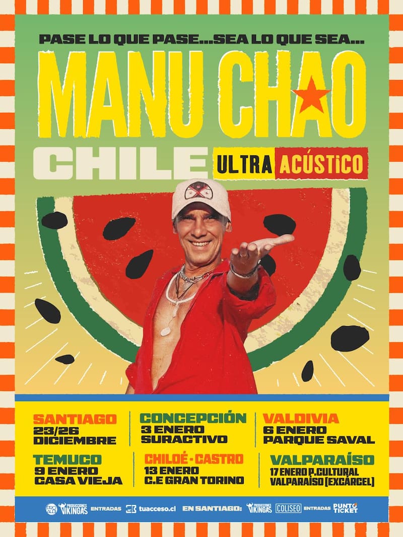 Esta temporada, Manu Chao está de vuelta en Chile. Participó como invitado en el histórico show de Macha y el Bloque Depresivo en el Estadio Nacional. Además de tocar en Santiago, se presentará en Concepción (3 de enero), Valdivia (6 de enero), Temuco (9 de enero), Chiloé (13 de enero), Valparaíso (17 de enero).