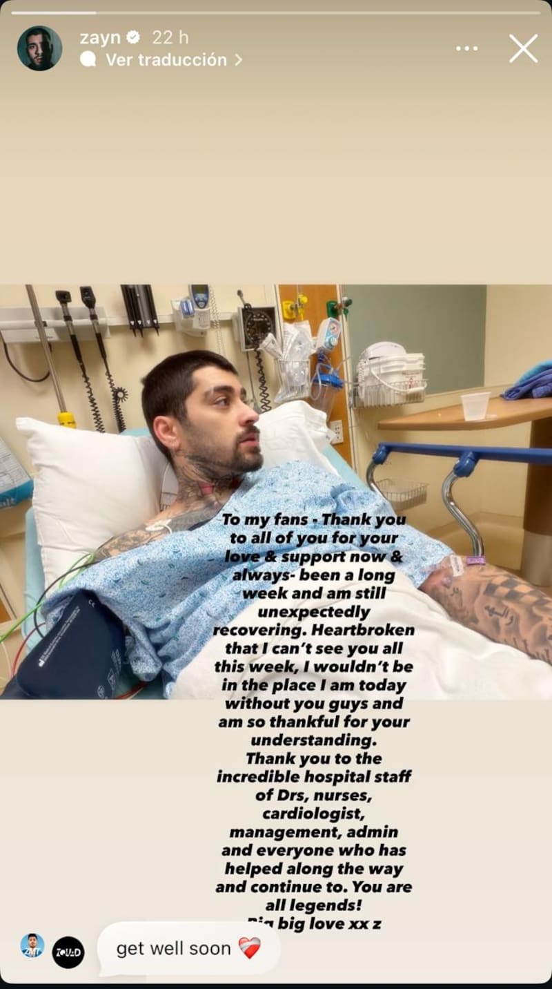 Fue a través de sus redes sociales que dio el anuncio. “A mis fans: Gracias a todos por su amor y apoyo, ahora y siempre. Ha sido una semana larga y aún me estoy recuperando inesperadamente. Me duele mucho no poder verlos a todos esta semana”, señaló Zayn.